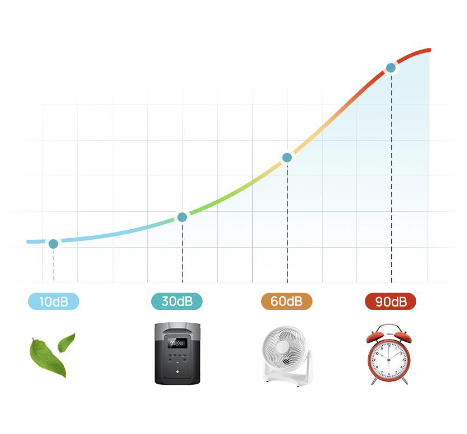 Wanneer het ingangs- of uitgangsvermogen van de Delta 2 Max minder is dan 500W, produceert het powerstation minder dan 30 dB aan geluid. Dit maakt het zeer stil en ideaal voor gebruik in de slaapkamer, kleine kamers, campers, tenten of caravans.